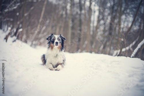 Portrait of an Australian Shepherd in the forest during the winter. Dog in snowy landscape. Furry dog sitting in the snow