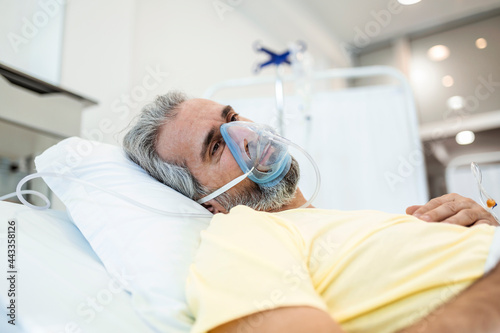 Portrait of an elderly patient, with oxygen mask, in a hospital bed. Man in bed with oxygen mask in hospital, Healthcare workers in the Coronavirus Covid19 pandemic
