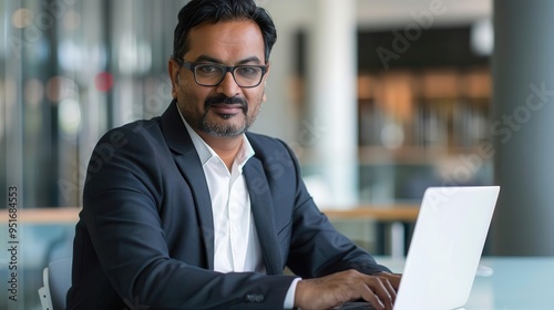 portrait of an indian businessman working on a laptop in a modern office setting professional attire and focused expression convey dedication and expertise in a global business context