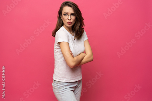 Portrait of an upset young casual girl standing with arms folded isolated over pink background.