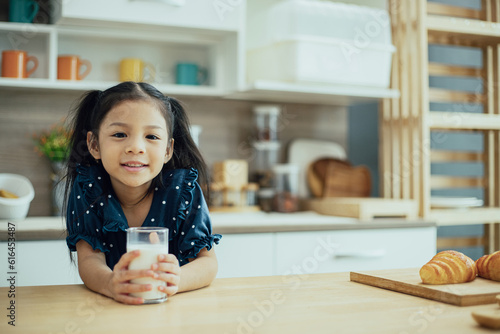 Portrait of Asian little girl holding a cup of milk in kitchen in house. Young preschool child girl or daughter stay home with smiling face.