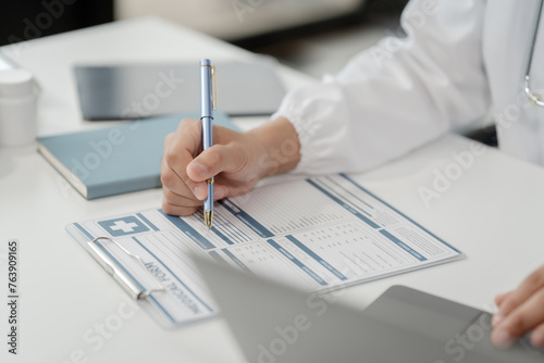 Portrait of Asian middle age male doctor in white lab coat and stethoscope while consult online in laptop via video conference. advice on good mental health management and medical treatment costs.