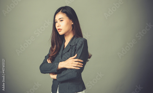 Portrait of Asian woman, happy working day.beautiful modern businesswoman ,holding tablet computer on Gray background in the studio