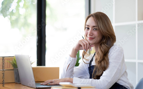 Portrait of Asian young woman SME working with a box at home the workplace.start-up small business owner, small business entrepreneur SME or freelance business online and delivery concept.