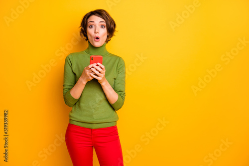 Portrait of astonished crazy girl use cellphone read wonderful information impressed scream wow omg wear good look clothes isolated over shine color background