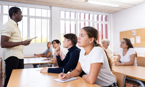 Portrait of attentive positive young female student studying on training session in lecture class