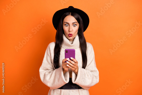 Portrait of attractive amazed woman using device pout lips browsing web media news isolated over bright orange color background