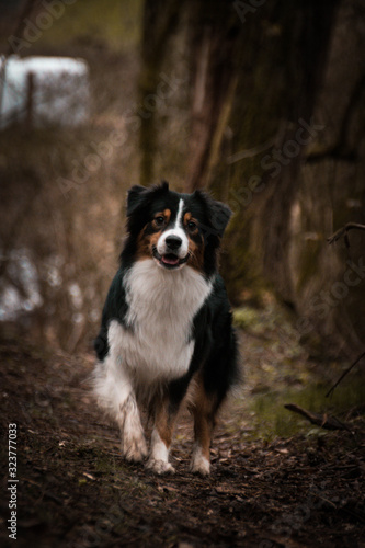 Portrait of Australian shepherd dog, who is standing in forest, mysterius atmosphere