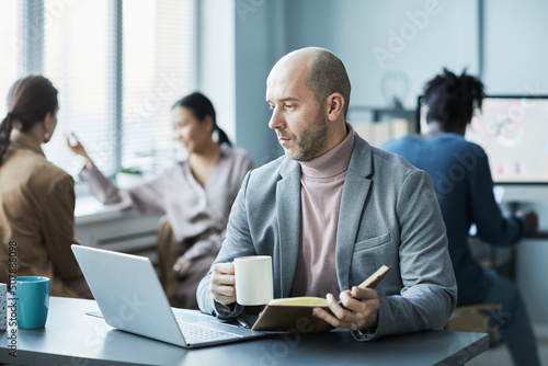 Portrait of balding mature man working with laptop in office setting and enjoying cup of coffee, copy space
