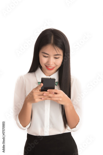 Portrait of beautiful asian business woman, talking on the cell phone, on white background.