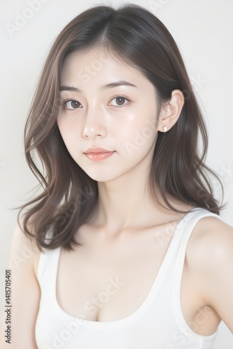 Portrait of Beautiful Asian Woman with Wavy Hair and Natural Makeup Wearing White Tank Top