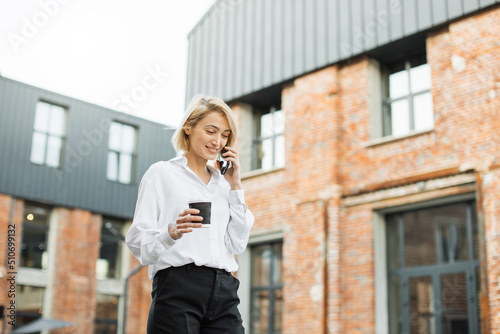 Portrait of beautiful blond woman having cup of fresh take away beverage talking to partner using smartphone walking on city street looking outside camera.