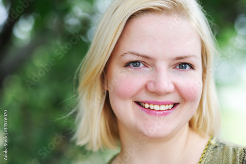 portrait of beautiful happy blond woman in the park