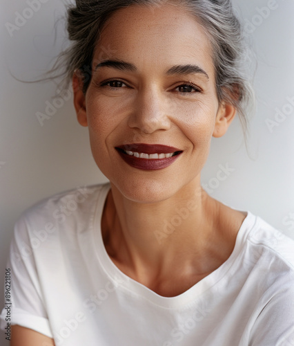 woman, portrait, natural, mature, hair, skin, casual attire, calm, beauty, beautiful, smile, smiling, relaxation, t-shirt, wellness, age, 1, style, stylish, sensual, sensuality, well-being, care, serenity, calmness, relax, serene, healthy, health, retired, mindful, mindfulness, peace, face, model, looking, make-up, cosmetic, femininity, female, attractive, white, hispanic, cheerful, happiness, joy