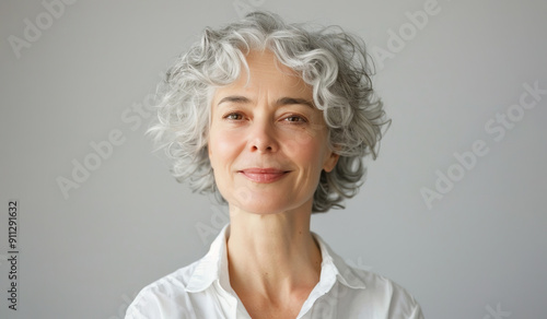 woman, portrait, natural, hair, skin, mature, fashion, calm, beauty, beautiful, relaxation, spa, grey, wellness, age, 50s, 60s, casual attire, 1, style, stylish, sensual, sensuality, well-being, care, serenity, calmness, relax, serene, healthy, health, retired, mindful, mindfulness, peace, face, smile, smiling, model, looking, make-up, cosmetic, femininity, female, attractive, shirt, white, copy space