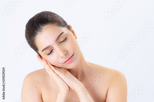 Portrait of beautiful woman asian makeup of cosmetic, girl hand touch cheek and smile attractive, face of beauty perfect with wellness isolated on white background with skin healthcare concept.