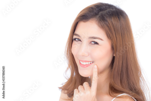 Portrait of beautiful woman asian makeup of cosmetic, girl hand touch teeth and smile attractive, face of beauty perfect with wellness isolated on white background with skin healthcare concept.
