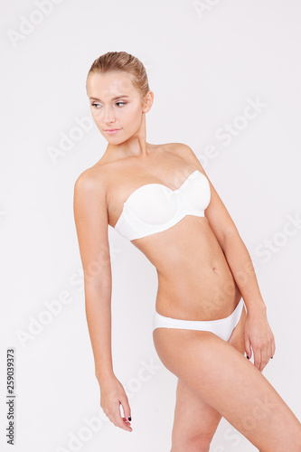 Portrait of beautiful woman in white lingerie posing in studio. Perfect body. Diet. Fitness