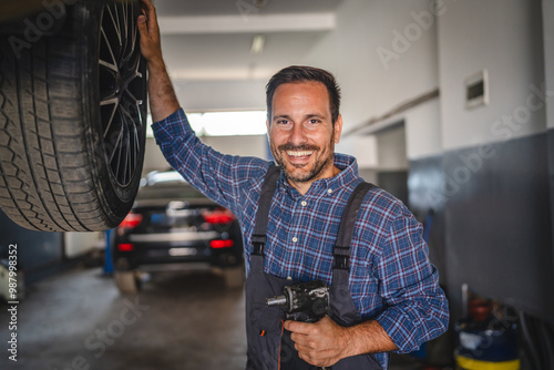 portrait, man, adult, mechanic, wheel, garage, automotive, smile, cheerful, uniform, tire, rim, tool, precision, work, tool, repair, vehicle, sharpened, auto, car repair, engineering, maintenance, tire, workshop, service, hand tool, professional, expertise, craftsmanship, modern, handling, equipment, care, safety, machinery, hand tool, hydraulic lift, automobile, male, 1, caucasian