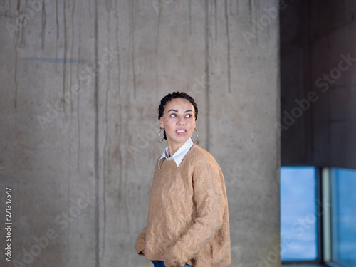 portrait of casual businesswoman in front of a concrete wall