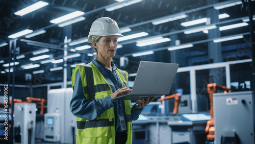 Portrait of Caucasian Female Engineer Using Laptop Computer and Looking Around a Factory Facility with Equipment Producing Modern Industrial Machinery Components with Robotic Arms on Assembly Conveyor
