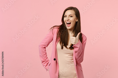 Portrait of cheerful laughing young woman in jacket looking camera, showing thumb up isolated on pastel pink wall background in studio. People sincere emotions, lifestyle concept. Mock up copy space.