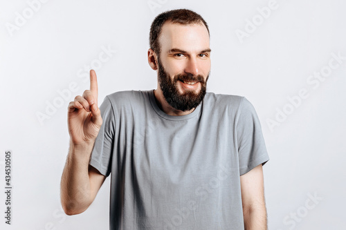 man, background, upwards, photogenic, brunette, beard, person, male, caucasian, isolated, white, confident, guy, model, portrait, studio, happy, grey, shirt, smile, smiling, young, adult, casual attire, friendly, fashionable, alone, look, masculine, muscular, face, moustache, bearded, serious, decision, businessman, decide, entrepreneur, buyer, advertising, head, grey, concept, boss, professional, work, business, manager