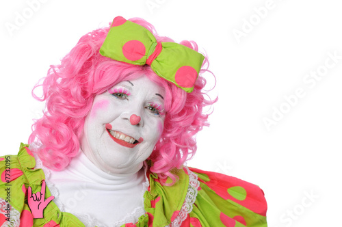 clown, colourful, bow, circus, costume, face, fair, grin, pink, green, hair, happy, isolated, hand, make-up, make-up, female, woman, nose, party, posed, smile, studio, up, white, wig, older