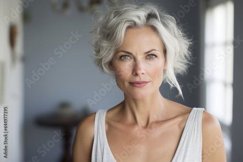portrait, adult, woman, lady, confident, relax, calm, face, 50s, beautiful, person, people, human, white, caucasian, pretty, grey, hair, young, girl, closeup, smile, happy, beauty, positive, age, background, youth, female, casual attire, businesswoman, business, model, fresh, fashion, stylish, modern, indoor, dress, enjoy, look, carefree, home, work, elegant, satisfied, front, climax, smiling