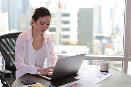 Portrait of confident and beautiful young asian businesswoman with happy emotion sitting and using computer in modern hotel with city blurred background. Success business and lifestyle concept