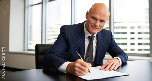 Portrait of confident mature businessman sitting at his desk and signing contract