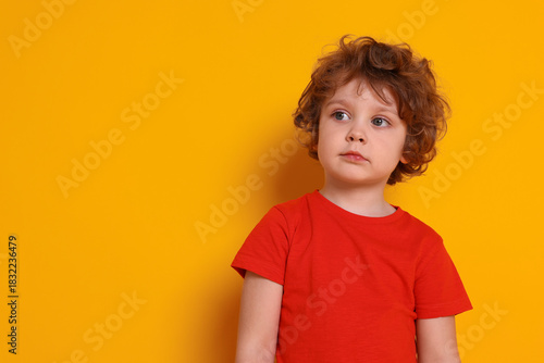 Portrait of cute little boy on orange background, space for text