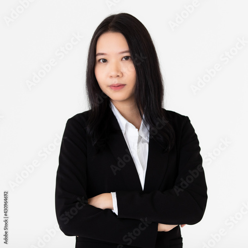 Portrait of cute long black hair Asian woman poses with friendly smile face and self-confident on white background