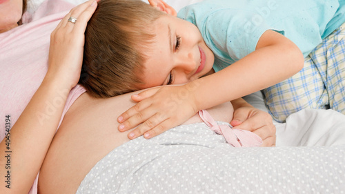 Portrait of cute smiling toddler boy hugging and stroking his pregnant mother with big belly. Concept of loving children and family happiness expecting baby