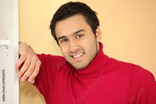 adult, orange, supported, edge, arm, chest, song, colours, collar, decor, decorated, rack, shelf, background, pink, pleasure, man, picture, jersey, wool, brown, wall, person, pigment, paint, pullover, flange, bracket, portrait, smiling, salmon, sweater, septum, male, masculine