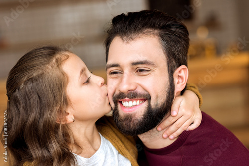 portrait of daughter kissing smiling father in cafe