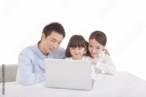 Portrait of daughter with parents,looking at laptop
