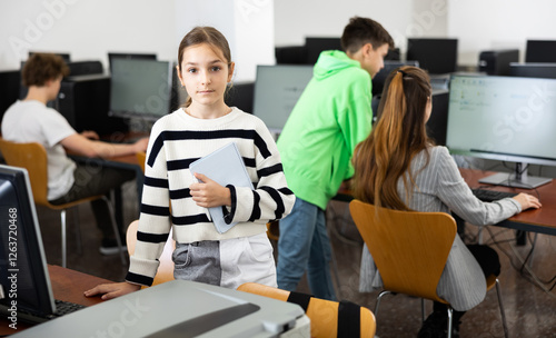 Portrait of diligent interested teen schoolgirl ready for lesson in computer class, standing near table with workbook in hands..