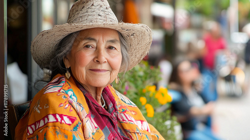 Portrait of Elderly Woman in Straw Hat and Orange Jacket