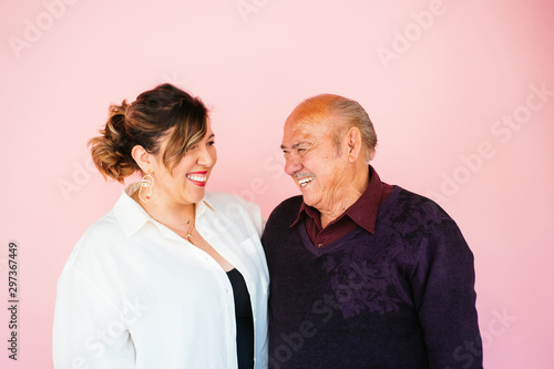 Portrait of eldery Latino grandfather with granddaughter in studio environment