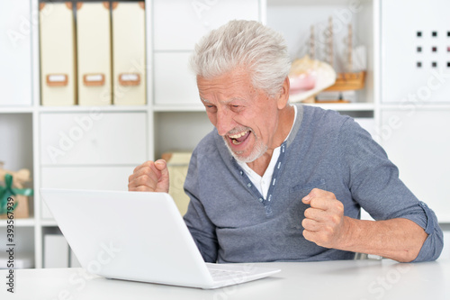 Portrait of emotional senior man using laptop