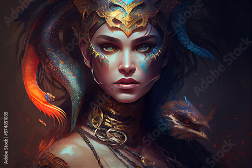 eve, snake, generative, ai, portrait, colourful, high-coloured, woman, face, art, illustration, model, person, eye, black, mystery, people, colours, fantasy, digital, painting, lady, beauty