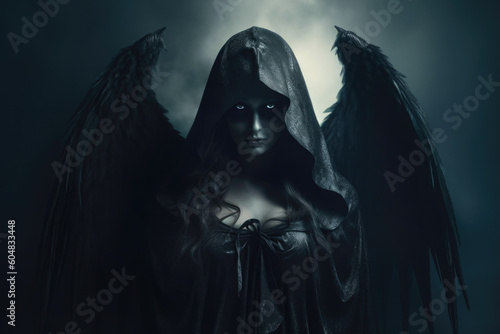 Portrait of Fallen Angel Woman in Black Clothes, Hooded with Wings. AI generative. Angel of Death.