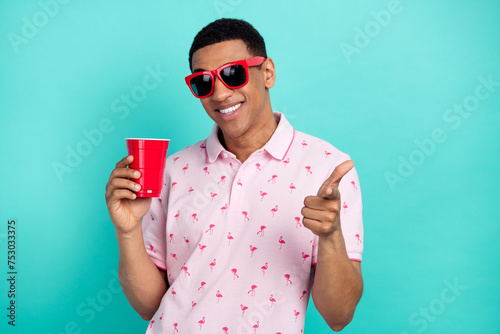 Portrait of friendly nice man hold drink cup point finger camera you isolated on turquoise color background