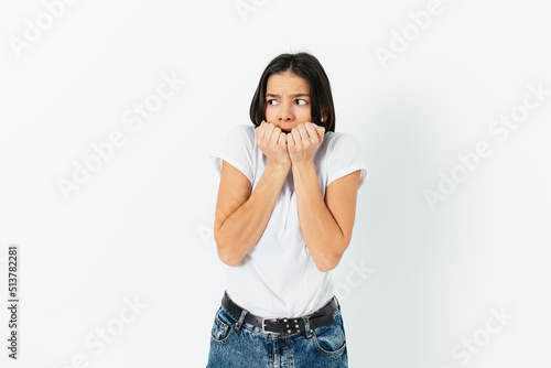 afraid, anxiety, biting, brunette, casual attire, caucasian, denim, face, fail, fear, female, finger, frightened, frustrated, girl, hispanic, jean, lady, latin, lifestyle, look, negative, nervous, panic, people, portrait, pressure, problem, sad, scared, shy, standing, stressed, studio, panicked, trouble, t-shirt, unhappy, upset, edgy, white, woman, worried, young