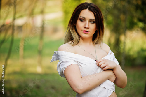 Portrait of girl with streaked hair, wear on white blouse, showing her shoulders.