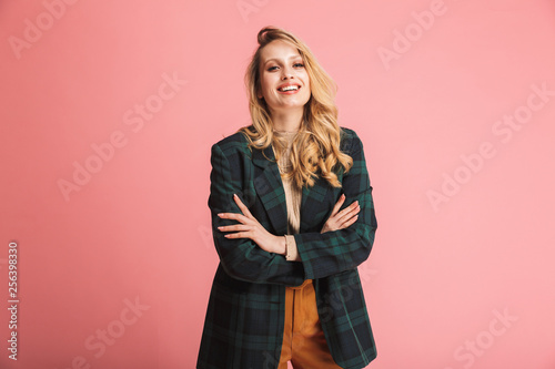 Portrait of glamour blond woman 30s in stylish outfit smiling and posing on camera