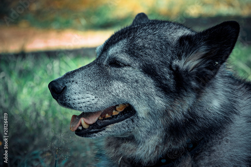 Portrait of gray husky in profile, the dog's eyes are closed and his mouth is ajar