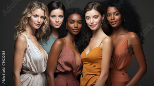 Portrait of group of five beautiful women with natural beauty, glowing smooth skin and beautiful hair