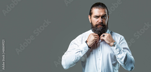 Portrait of handsome bearded man in white shirt. Male beard and mustache. Sexy male, brutal macho, hipster. Elegant handsome man in white shirt